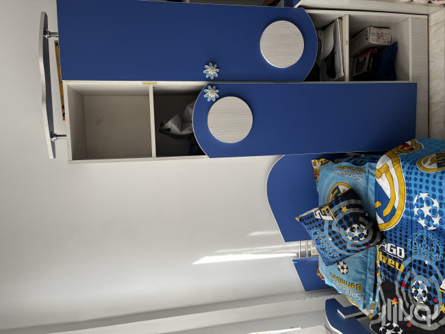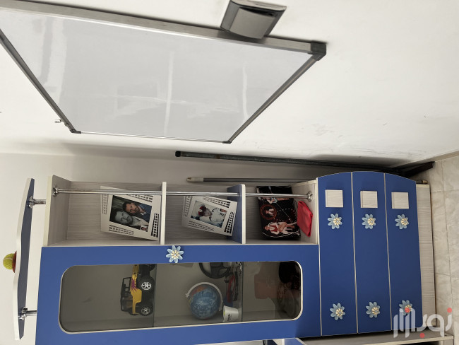 تخت خواب نوجوان به همراه تشک یک کمد ویترین با سه کشو و یک کمد لباس