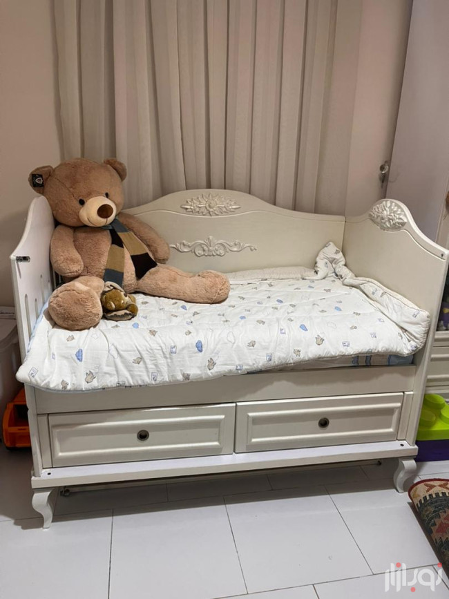 سرویس تخت خواب کاملا سفارشی ساخته شده جنس بدنه عالی و محکم بدوم هیچ ضربه یا خط و خشدارای تخت و کمد ویترین و یک شلفهر کدام دارای کشو هستنو جلوی تخت محافظ داره که خودم برداشتم ولی قابل نصب هستدارای تشک و رو تختیخریدار واقعی تخفیف هم داره
